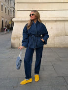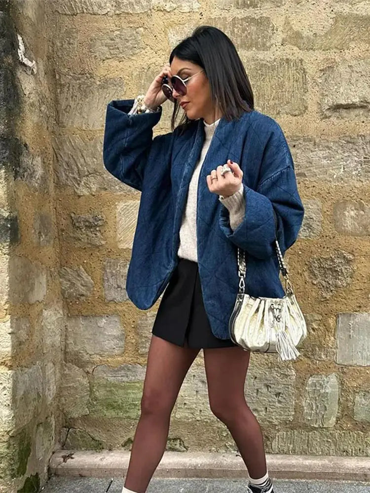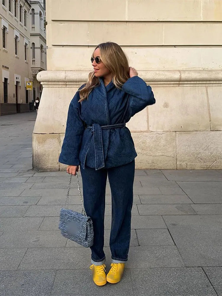 - Fashion-Forward Design: Modern denim coat with a chic collar and belt.