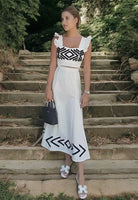 The Celia Set is perfect for standing out with elegance and freshness during the summer season. This set features a sleeveless blouse adorned with ruffle details on the shoulders and a long skirt that adds a romantic and feminine touch. The plaid print of the fabric will help you stand out in the crowd and express your personal style.