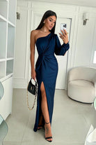 Crafted from satin fabric that glides over the skin, this one-shoulder dress features elegant draping and a side slit that adds a touch of allure. Perfect for any occasion, from gala nights to romantic dinners, it’s available in a range of colors to suit your unique style.