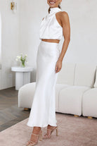 The Valentina set is made up of a top and a satin skirt. The top features an asymmetric design with a high neck that adds a touch of sophistication, while the soft draping enhances the delicacy of the garment. The long skirt, with a simple and fluid cut, falls gracefully, creating a slim and slender silhouette. Perfect for special occasions, this set stands out for its combination of elegance and modernity, ideal for those looking for a refined and contemporary look.